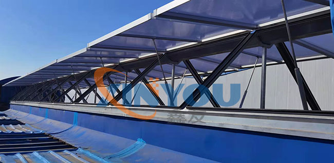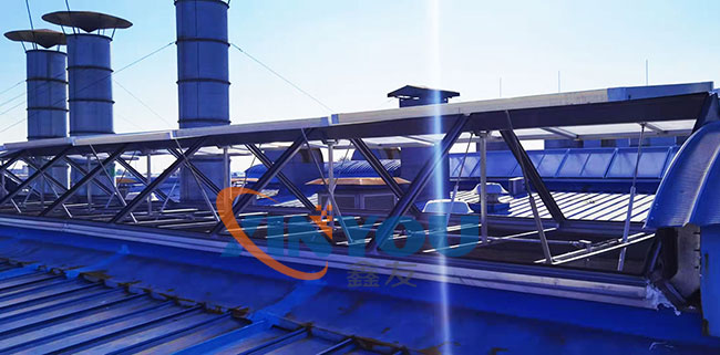 鑫友承接中車唐山8列動車組涂裝廠房電動采光排煙天窗的設(shè)備供應(yīng)及安裝工程,天窗選擇鋁合金電動三角形采光排煙天窗,配置螺桿式開窗機,消防聯(lián)動控制箱。