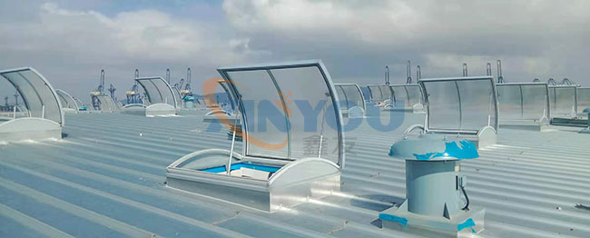 圓拱形的設(shè)計,外觀美觀大氣,能更好的防水,同時有效減少風壓阻力,天窗頂部為采光板,有效增加室內(nèi)亮度,開啟電機設(shè)計成24V電壓,可連接消防聯(lián)動控制系統(tǒng)及風、雨、煙感應(yīng)器。***開啟角度為45°。