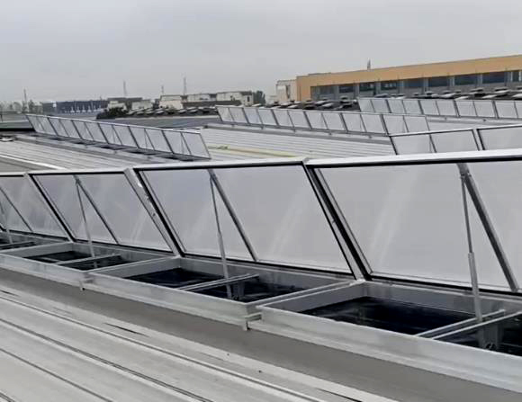 上圖為一字型電動(dòng)采光排煙天窗,一字型的外觀,兼具采光于通風(fēng),并可有效減少風(fēng)壓阻力,天窗頂部采用采光板,窗體與屋面成平行面,此窗型為連體式窗型,由若干個(gè)單體式窗型組合而成。