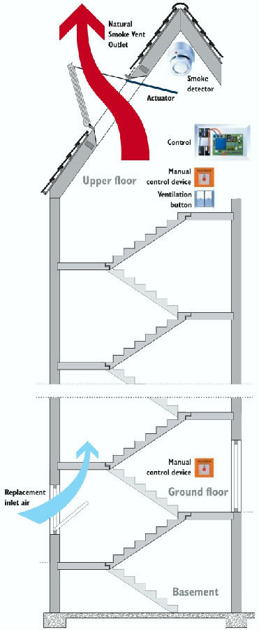 由智能控制箱、消防緊急按鈕、煙霧感應(yīng)器、墻裝開關(guān)、遙控器、風(fēng)雨感應(yīng)器、開窗器等組成,智能消防控制箱與建筑的消防控制室相連,并連接煙霧感應(yīng)器,消防緊急按鈕,發(fā)生火災(zāi)時無論手動報警信號還是自動報警信號傳送至控制箱,控制箱均立即自動命令下級開窗器進行開窗動作,從而迅速將室內(nèi)的有毒煙霧排出。