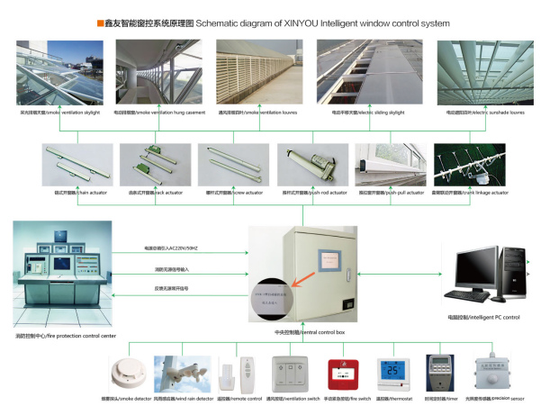 智能通風控制系統(tǒng)由智能控制箱、墻裝開關、遙控器、風雨感應器、開窗器等組成,用戶可根據(jù)日常室內(nèi)環(huán)境的變化,通過遙控器或者開關來對窗戶進行開啟和關閉的控制。