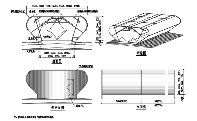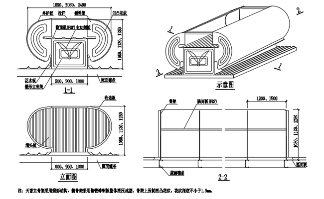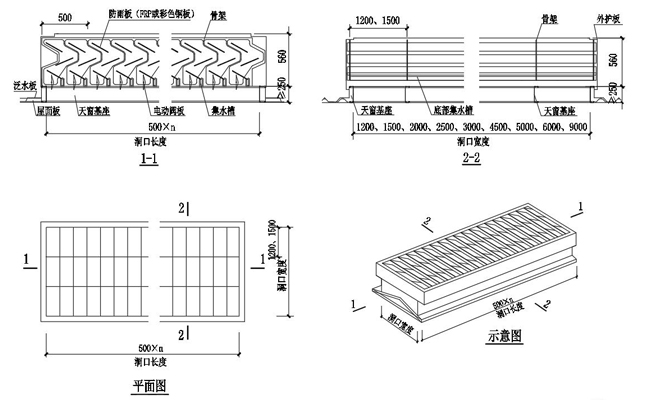 3. 通風(fēng)天窗側(cè)面外護(hù)板為彩鋼壓型板,泛水包邊板用彩鋼板折彎而成。
